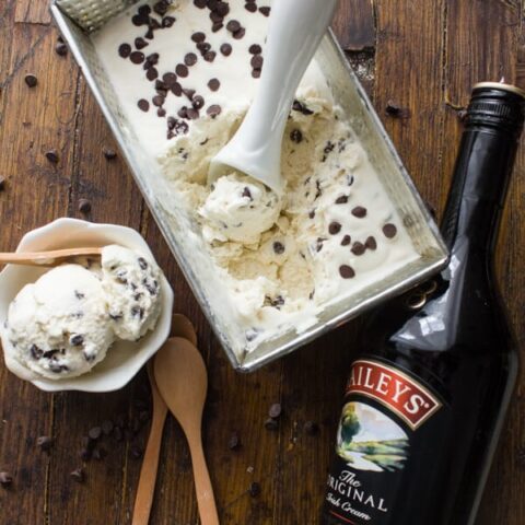 This no-churn ice cream is just for the adults. Sorry, kiddos! For those Baileys lovers, this chocolate chip no-churn recipe is for you.
