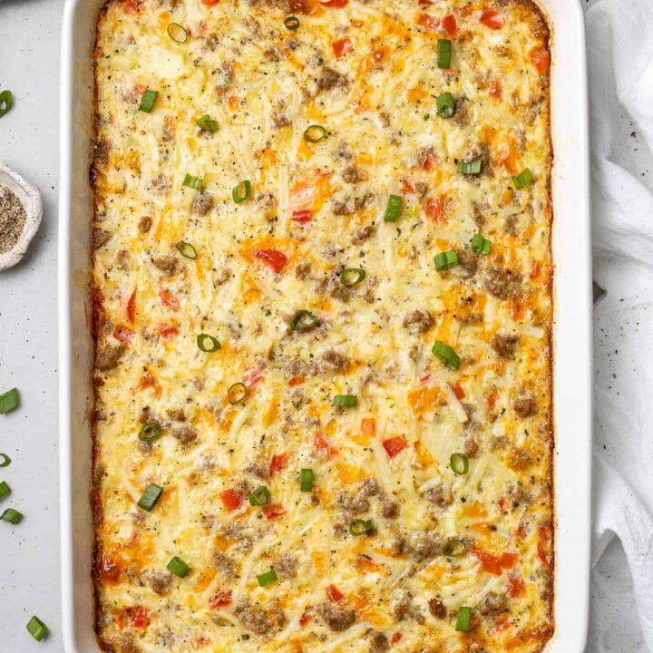 This easy breakfast casserole with sausage, eggs and cheese is perfect for special mornings or overnight guests! It's a great egg-based side to have alongside a sweet dish like French toast, pancakes or waffles.
