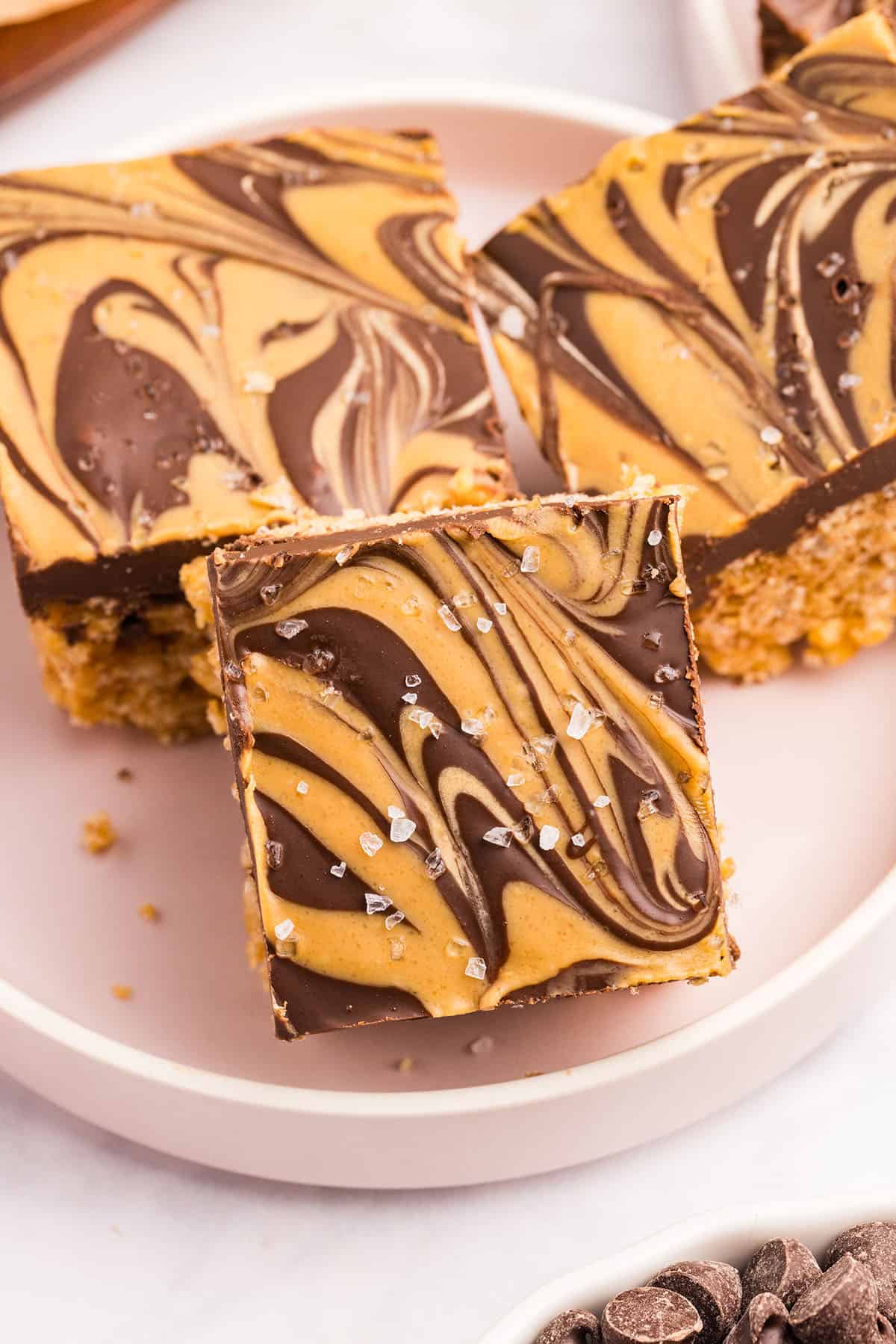 - Warm the reserved 2 tablespoon creamy peanut butter in the microwave for 20 seconds. Then drizzle over the chocolate and use a toothpick or knife to create swirls. Top with ¼ teaspoon flaky sea salt, if desired.