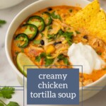 This Creamy Chicken Tortilla Soup is a warm, hearty hug in a bowl. Shredded chicken, black beans, and corn simmer in a rich, creamy broth with just the right amount of spice. Top it with crunchy tortilla chips, and a squeeze of lime, and you've got a simple, satisfying meal that's ready in no time!