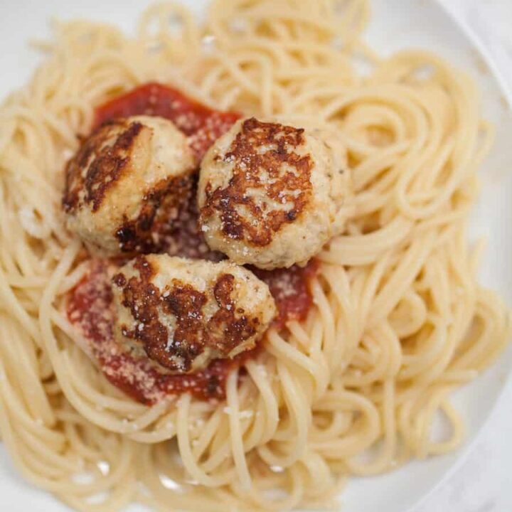 Baked Chicken Meatballs are a quick protein option that can be added to salads, rice, pasta, or even served as an appetizer. These are not your average meatballs, made with ground chicken and packed with flavor! You can make them ahead and freeze them, then reheat while you cook pasta for an easy spaghetti night.