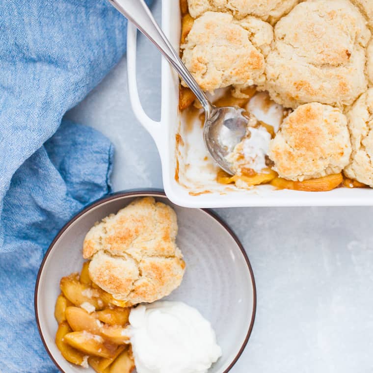 Sweet, soft peaches topped with flaky biscuits make for the best homemade fresh Peach Cobbler! This easy summer dessert is easy to pull together and serves 9, perfect for summer gatherings. Top this peach cobbler with a scoop of ice cream or Greek yogurt!