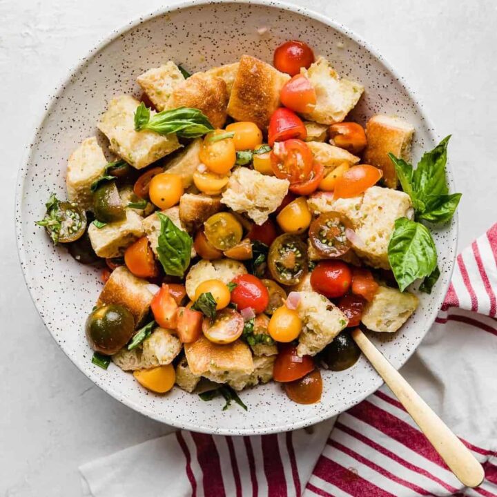 This panzanella toscana is a light and refreshing side salad, perfect to accompany any grilled shrimp!