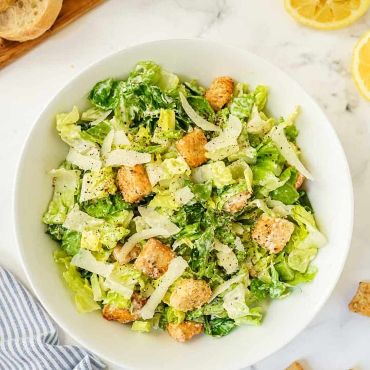 Homemade Caesar salad is fantastic with shrimp on top. Crisp romaine lettuce, croutons and fresh Parmesan cheese are all topped with a creamy homemade dressing that comes together in minutes!