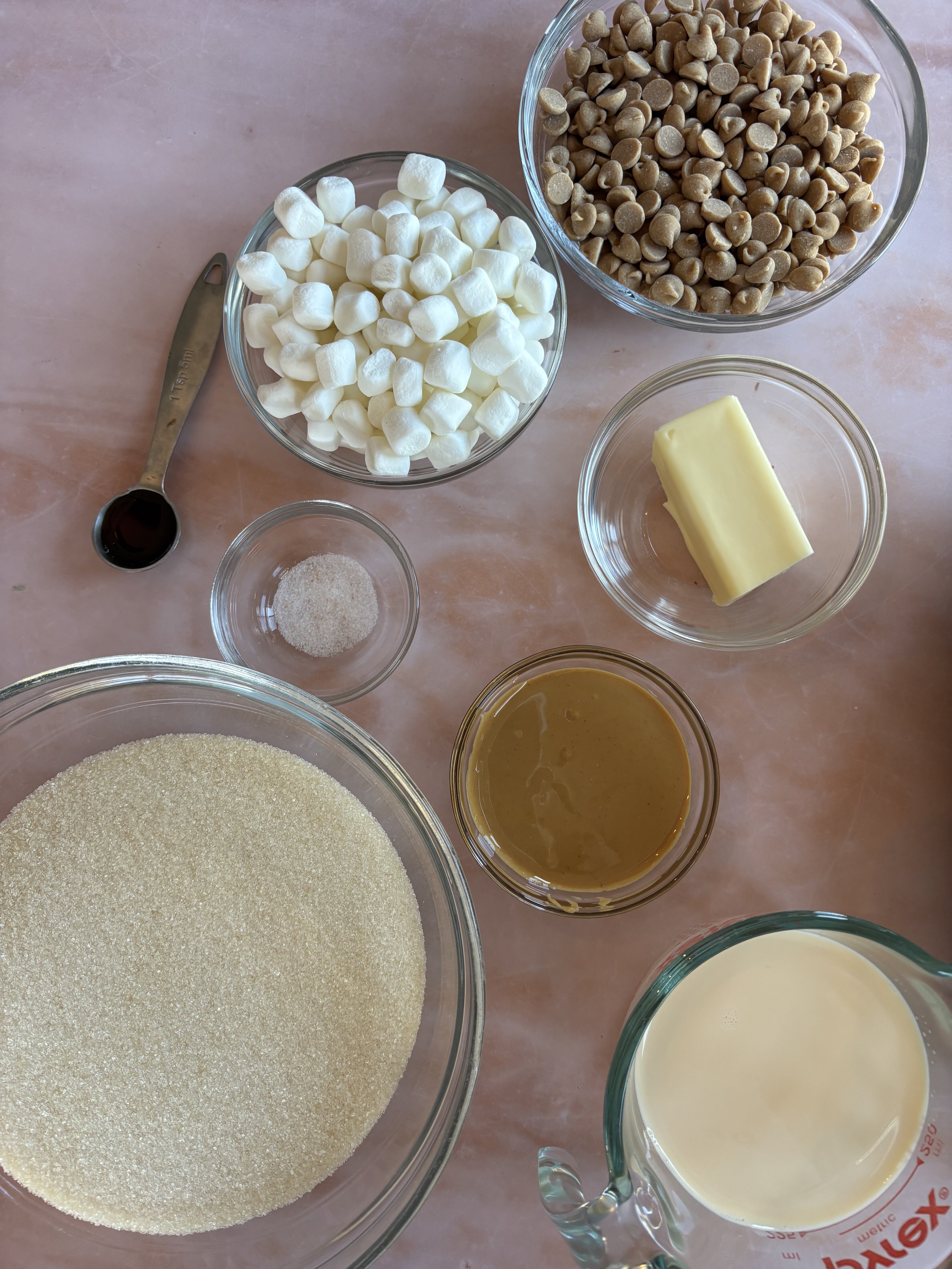 This creamy peanut butter fudge recipe uses staple fudge ingredients like unsalted butter, evaporated milk, sugar, salt and mini marshmallows.