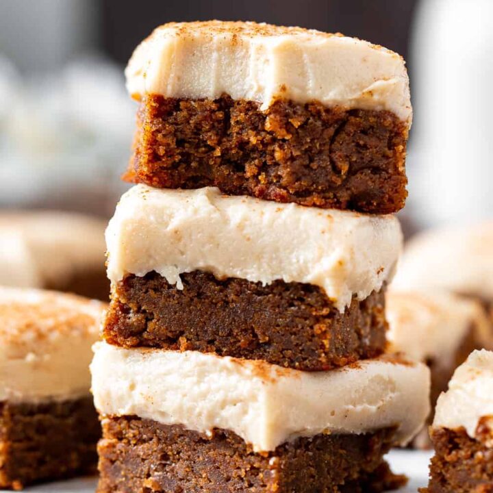 These Paleo Pumpkin Bars are a fun and healthy way to enjoy fall baking season! Soft fudgy pumpkin blondies flavored with lots of pumpkin pie spices are topped with a honey cream cheese frosting for the ultimate fall themed pumpkin bars!