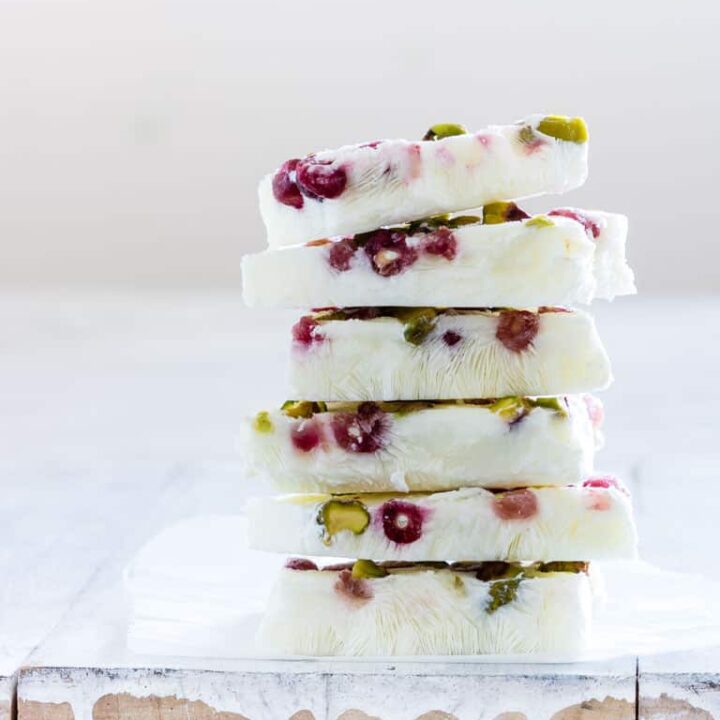 This colourful and healthier Pistachio and Pomegranate Frozen Yogurt Bark is an easy to make yogurt snack or dessert that the whole family will love. It needs only 4 common ingredients and a few mins to make.